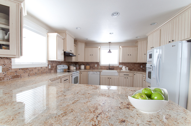 I am so happy with the transformation. This kitchen was quite the journey, it really pushed me out of my comfort zone and forced me to take a few risks. I really like high contrast so I thought I wanted dark granite. When my husband and I went to pick out the granite I didn't see a dark granite I loved, I was so sad, I took home some samples of light granite to see what I liked with the cabinets. Trying to match cabinets with a sliver of granite is quite the task. I stewed over it for a few days went back to the granite yard a few times and finally decided on this granite, and I couldn't be more happy with it. The best part about this granite is you can't tell when it is dirty. Very helpful with kids.