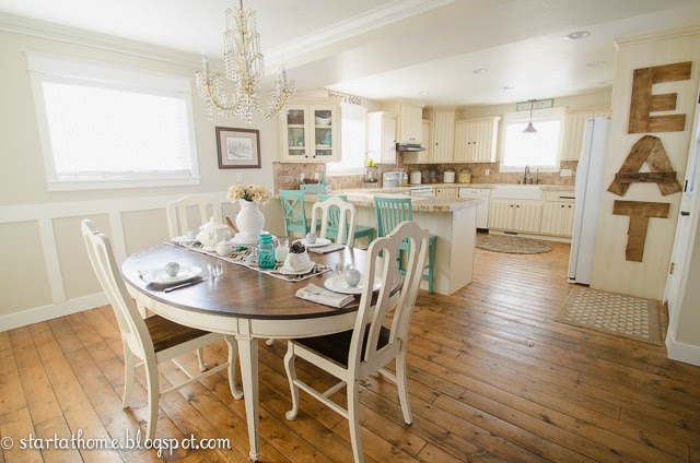 Beautiful table! ~love~ the distressing on the legs. Those turquoise chairs at the breakfast bar ROCK! You have such a lovely kitchen.